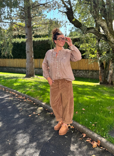 Chemise à carreaux & froufrous – TU jusqu’au 44 – Camel, chocolat ou noir 🖤