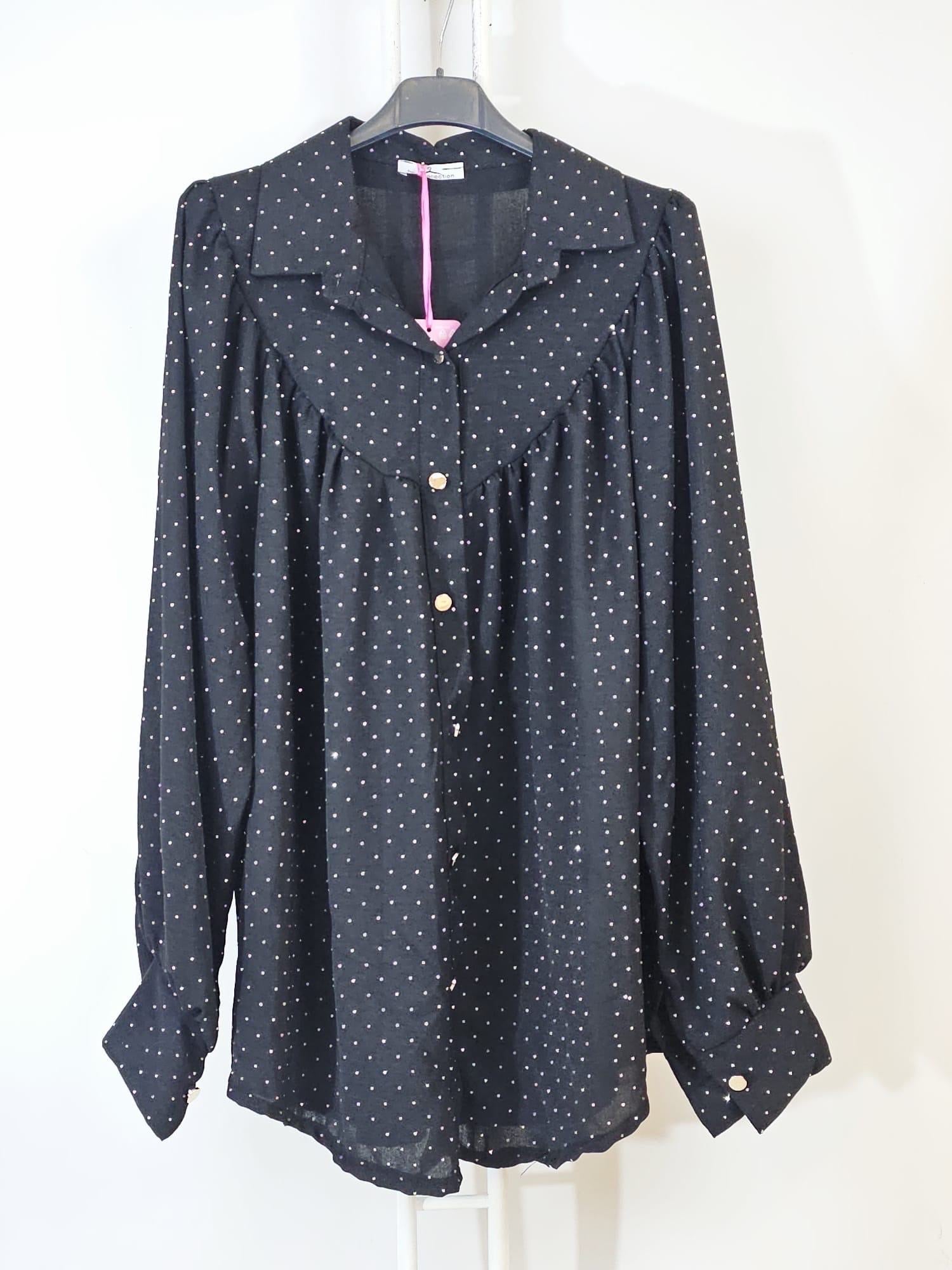 Coup de cœur assuré pour cette chemise fluide noire parsemée de petits brillants discrets ✨. Sa coupe légèrement ample lui permet de convenir jusqu’au 48. Le col, les jolis boutons et les poignets travaillés apportent une touche chic ★. Fabriquée en Italie, cette chemise est un indispensable du dressing d’automne ou d’hiver.