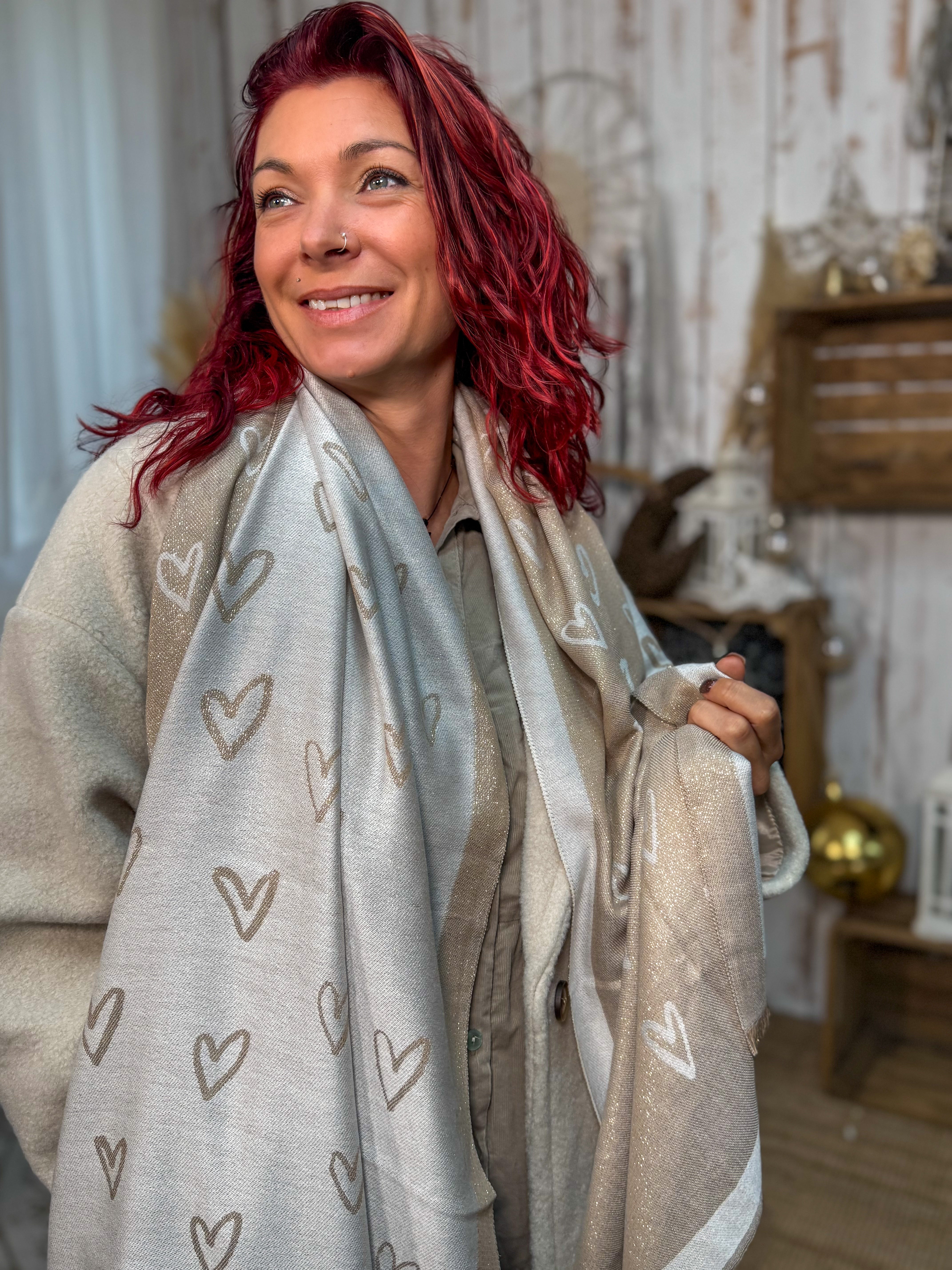 Ultra douce et moelleuse, elle se décline en trois teintes intemporelles – gris, beige et noir – ornées de jolis cœurs noirs pour un style tout en douceur. Avec ses dimensions généreuses, elle peut être portée en châle ou en écharpe bien enroulée. ★