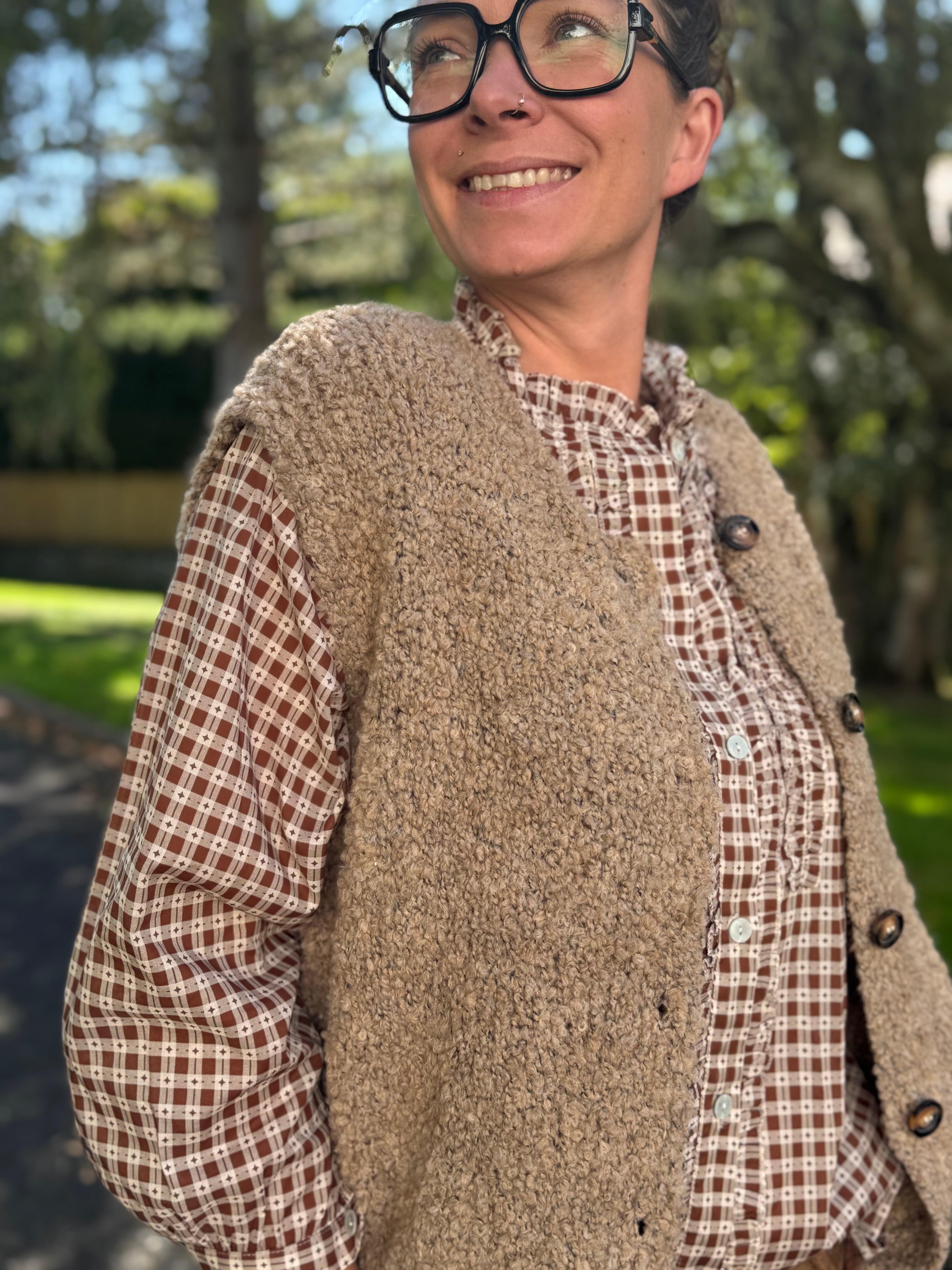 Ce gilet sans manches façon moumoute se porte sur une chemise, un pull ou une robe pour réchauffer vos tenues avec style. On adore ses jolis boutons et sa texture toute douce façon doudou 🫶